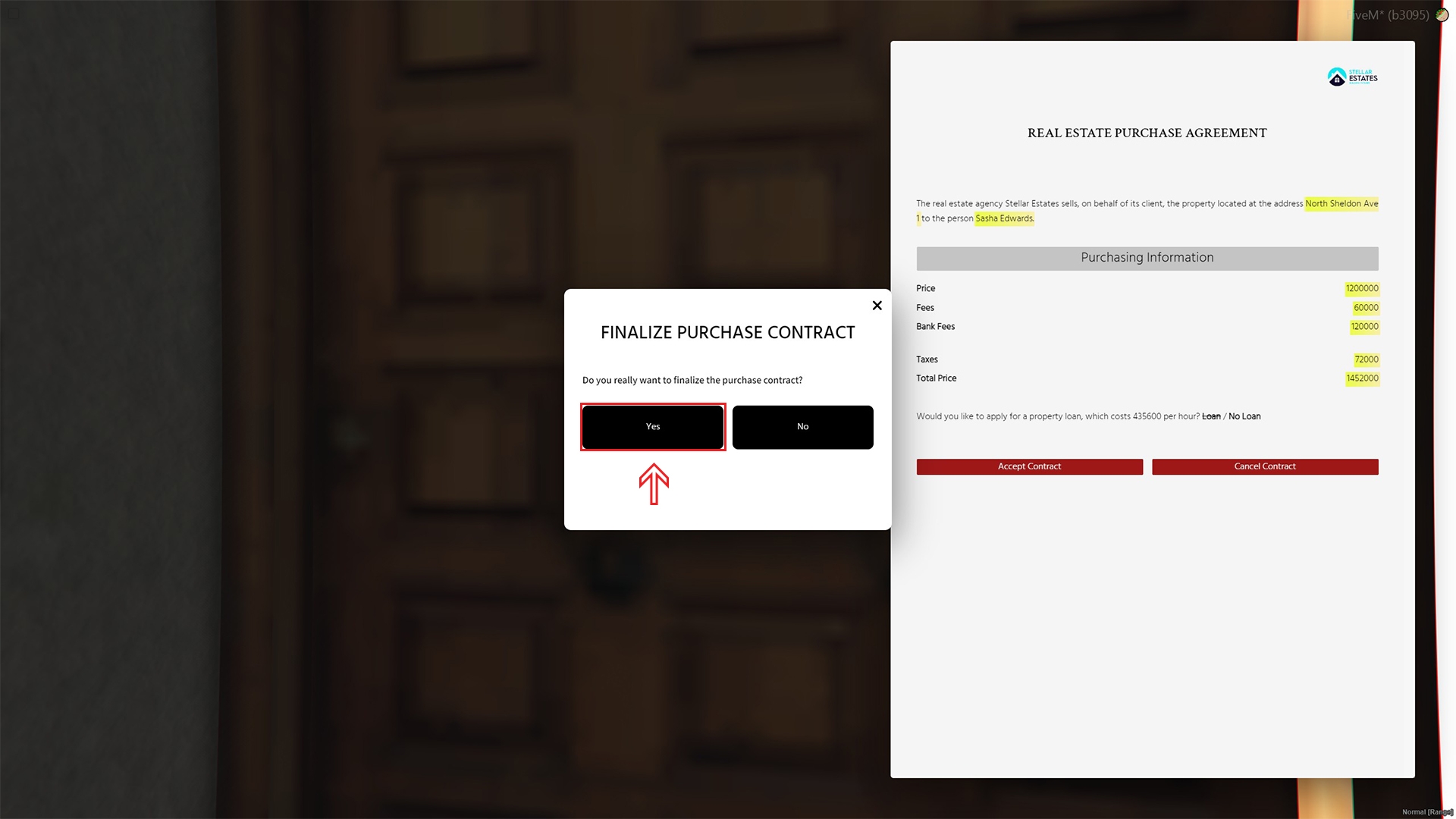 Once you’re happy with a house, walk back up to the front door and press E. Review the pricing then click the Accept Contract button. This will sign the house over to you and give you keys.