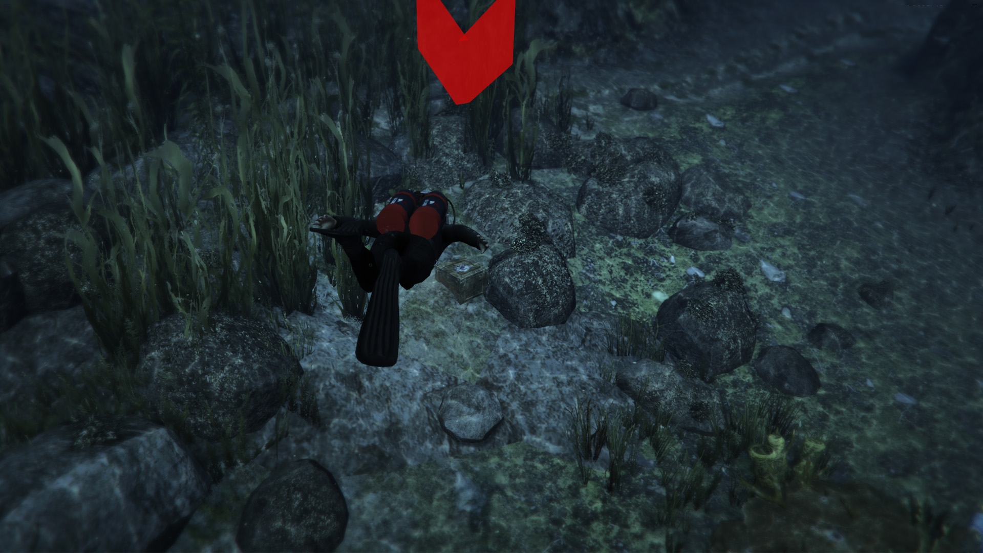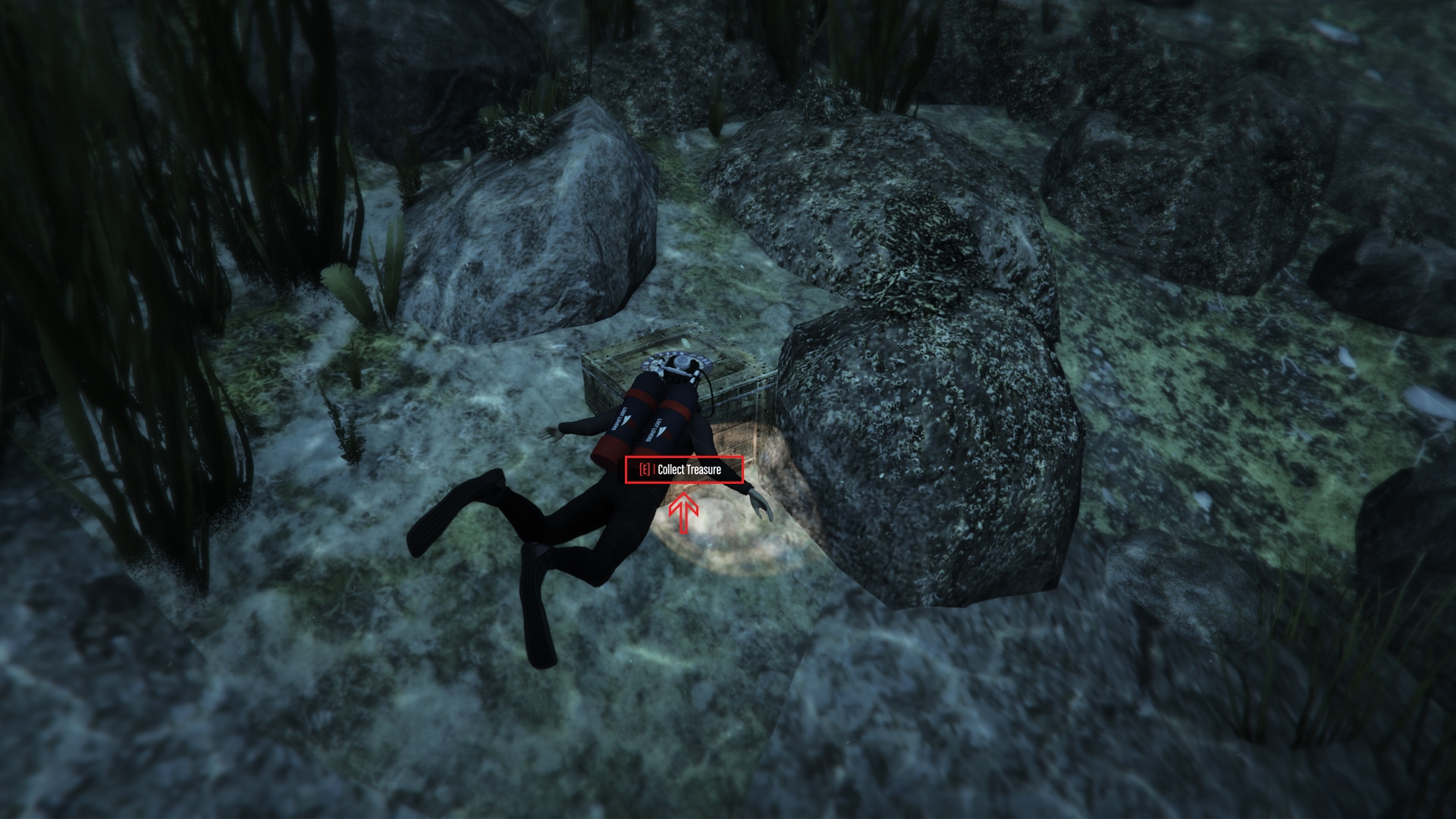 Jump off the boat into the water then use your space bar to dive under. Search for the treasure crate within the purple circle you stopped inside of. Once you get closer, you will hear a beeping noise that will increase in speed the closer you get. Once close enough, the crate will have a large red arrow above it.